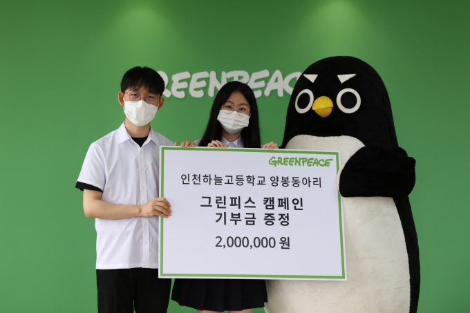 8일 인천하늘고등학교 양봉동아리는 서울 용산에 위치한 그린피스 서울사무소에서 기부금 전달식을 가졌다. 이날 전달식에는 인천하늘고등학교 학생 20여명과 담당 교사들이 참석했다. 학생들은 동아리 활동으로 직접 채밀한 꿀을 판매해 얻은 수익금 총 200만원을 그린피스 측에 전달하며 앞으로도 그린피스가 기후변화 대응과 생물다양성 보호를 위해 적극적인 활동에 나설 것을 당부했다.