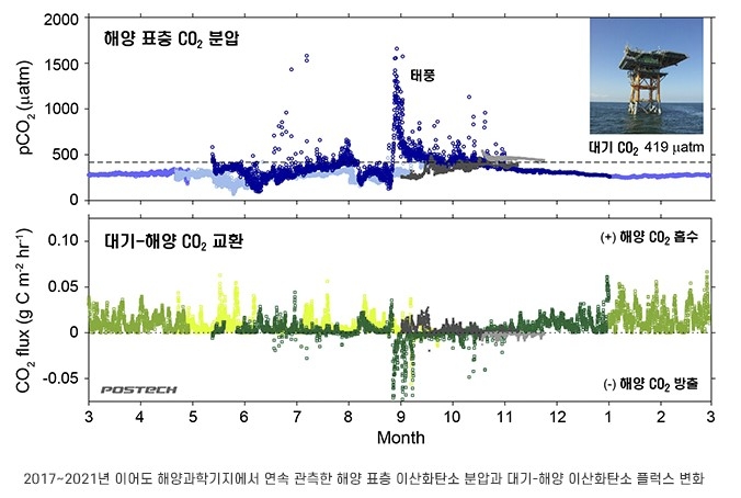 포항공과대학교 환경공학부 이기택 교수와 김자명 연구조교수 연구팀은 국립해양조사원, 한국해양과학기술원, 국립수산과학원과 공동으로 진행한 연구에서 바다가 이산화탄소를 흡수하는 원리를 밝혀냈다.