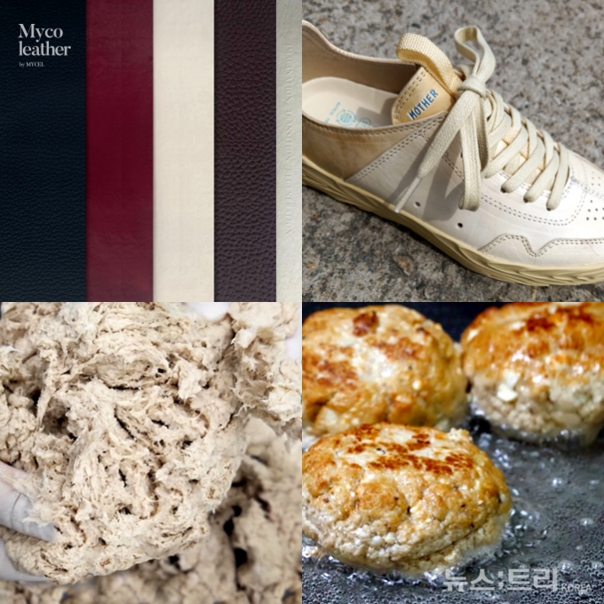 ▲버섯가죽(왼쪽위), 버섯가죽신발(오른쪽 위), 버섯 대체육(왼쪽아래), 버섯 대체육 요리(오른쪽 아래)