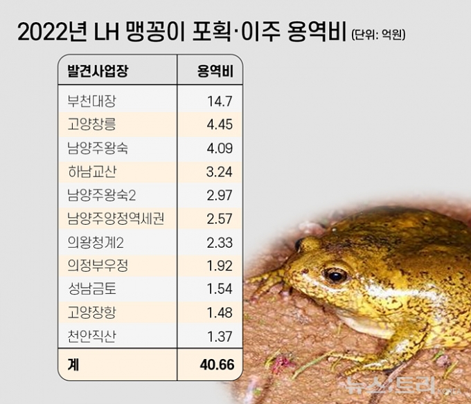 3일 경기주택도시공사(GH)에 따르면 광명·시흥테크노밸리 사업장에서 최근 지장물(불필요한 공작물, 농작물) 철거 작업 중 맹꽁이가 발견됐다. GH는 공사를 중단하고 1억3000만원짜리 '맹꽁이 포획 및 이주 모니터링 용역'을 긴급히 발주했다.