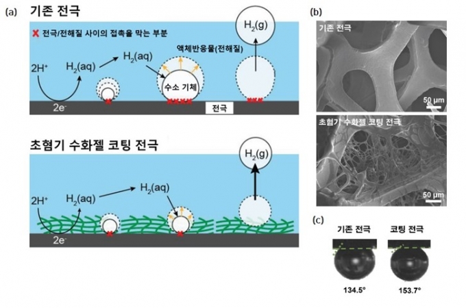 연구팀은 이 문제를 해결하기 위해 전극에 수화젤을 코팅하는 기술을 개발했다. 수화젤은 물을 잘 빨아들여 기저귀, 소프트렌즈 재료 등으로 쓰이는 물질이다. 이 물질을 전극에 코팅하게 되면 기체보다 물을 훨씬 더 좋아하는 성질(초혐기성) 덕분에 기체가 밀려나게 된다.