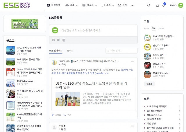 ESG 플랫폼은 ESG 콘텐츠, 생활 실천 공유 플랫폼이다. 페이스북, 블로그, 유튜브, 인스타그램, 카페 등 기존 소셜 미디어 장점을 총망라하고 있다는 것이 최대 장점이다. 즉 사용자가 소셜 미디어 기반으로 ESG 관련 콘텐츠와 생활 실천을 자유롭게 공유할 수 있다. 메뉴는 △타임라인 △멤버 △그룹 △블로그 △사진 △토론 △ESG 캠퍼스 △채용 정보 △공모전/캠페인/세미나 등으로 구성됐다.