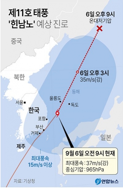 강력한 폭풍우를 동반한 제11호 태풍 '힌남노'가 6일 오전 9시 기준으로 울릉도 남남서쪽 약 110km 해상에서 시속 62km로 북동진하면서 한반도는 직접 영향권에서 서서히 벗어나고 있다.