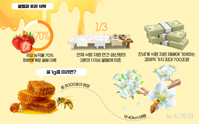 유엔식량농업기구(FAO)에 따르면 해마다 꿀벌은 700조원 규모의 경제적 가치를 창출하고 있다. 특히 과채류 생산에 있어 꿀벌은 없어서는 안 될 가장 유능한 농사꾼이다. 벌꿀 1g을 만들기 위해 꿀벌은 약 8000송이에 달하는 꽃을 오가며 꿀을 모은다. 이렇게 꽃과 꽃 사이를 날아다니면서 꽃가루를 옮긴 덕에 식물은 열매를 맺게 된다. 인류가 먹는 농작물의 70%가 이런 꿀벌의 꿀 채취 활동을 통해 얻어지고 있고, 전체 식량자원의 3분의 1 이상이 꿀벌에 직·간접적으로 의존하고 있다. 그래서 영국 왕립지리학회(RGS)는 꿀벌을 '살아있는 가장 중요한 생명체'라고 선언하기도 했다.