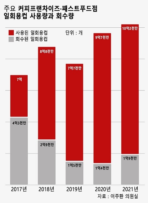 반면 지난해 업체가 회수한 일회용컵은 사용량의 19%에 불과했다. 2021년 회수된 일회용컵은 1억9000만개로 같은기간 사용량 10억2000만개의 약 19%인 셈이다.