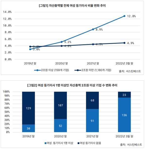 14일 ESG 전문 평가기관 서스틴베스트가 발간한 '넥스트 키워드' 이슈보고서에 따르면, 개정된 자본시장법 적용대상인 자산총액 2조원 이상인 159개 상장사는 전체 여성 등기이사 비율은 3.0%에서 12.8%로 증가한 반면, 자본시장법 개정의 영향을 받지 않는 자산총액 2조원 미만 기업에서 이 비율은 3.8%에서 4.9%로 거의 제자리걸음했다. 이 비율은 기업들의 여성 등기이사수를 합쳐 이사회 전체 인원수로 나눈 값이다.