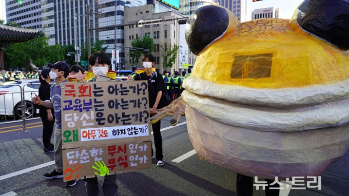 거대한 도롱뇽 오브제와 행진하던 전북 무주의 대안학교 푸른꿈고등학교 3학년 남정수(19)는 "전교생 60명 중 50명이 참석했다"며 "오지 못한 친구들 몫까지 더 큰 소리로 외치고 가겠다"고 말했다. 이어 "학교에서 환경에 대한 교육을 받고 있지만 환경교사가 너무 부족해 이에 대한 정책 마련을 요구하기 위해 행진에 참여했다"고 설명했다.