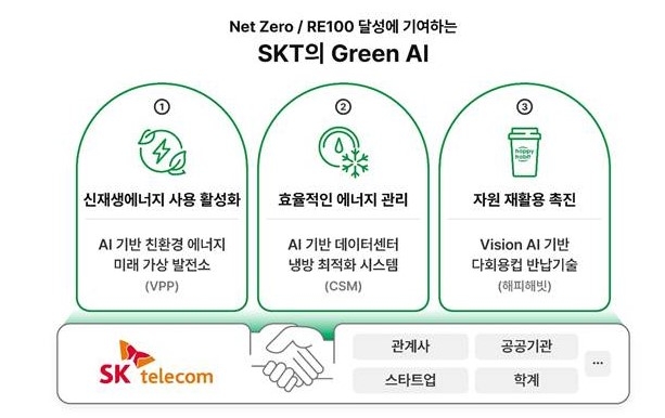 '그린(Green) AI'는 태양광·풍력 등 신재생 에너지를 통합관리하는 가상발전소 기술개발, 통신국사 에너지 최적 제어기술 개발, 플라스틱 절감 및 다회용컵 사용 촉진을 위한 비전(Vision)AI 기술개발 등이 담겨있다. 이를 위해 SK텔레콤은 SK에너지, 한국전기연구원, 식스티헤르츠, 소프트베리와 함께 미래 가상발전소(Virtual Power Plant, VPP) 기술개발을 위한 업무협약을 28일 체결했다.