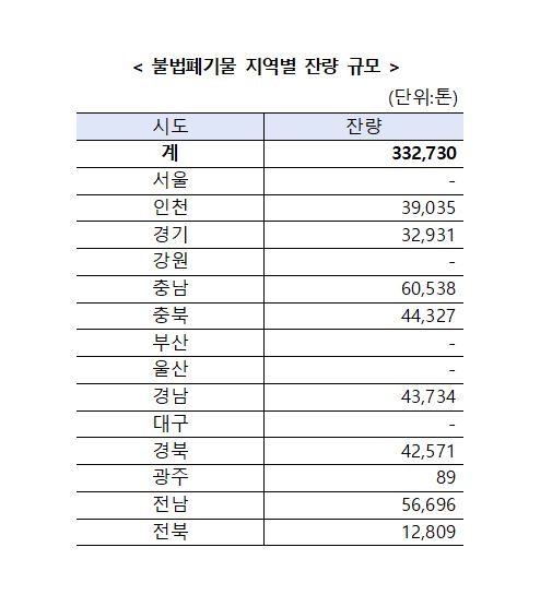 이 중 방치와 투기 등을 모두 합쳐 불법폐기물 잔량(추가발생 포함)이 가장 많은 지역은 충남(6만538톤), 충북(5만6696), 전남(4만4327)으로 적체된 불법폐기물 33만2000톤의 절반에 가까운 16만1561톤이 쌓여있다.