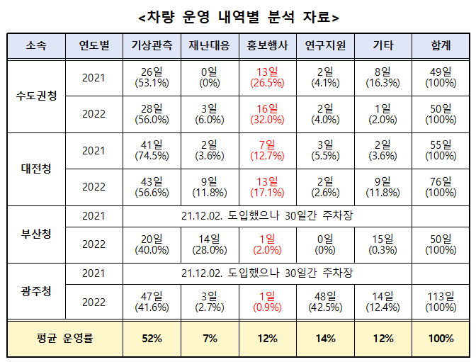 문제는 운영률만이 아니다. 차량운영의 세부내용에서도 도입취지가 무색한 문제점이 발견됐기 때문이다. 2020년 최초 도입할 때 기상청이 내세웠던 도입 목적과 완전히 다른 운영 방식이어서 논란이 예상된다.