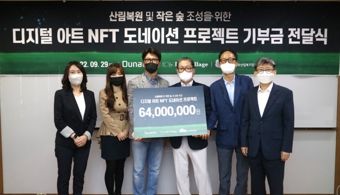 블록체인 및 핀테크 전문기업 두나무가 디지털 아트 전시회 '포레스트전'에서 발생한 NFT 낙찰 대금 일부와 판매 수수료 전액을 산림청 산하기관인 '한국산림복지진흥원'에 기부하는 전달식을 진행했다고 30일 밝혔다.