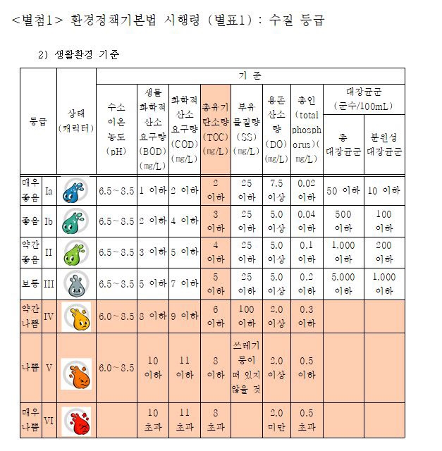 환경정책기본법 시행령이 정한 수질 및 수생태계 상태 기준을 보면 총 6등급으로 수질을 나누고 있다. 이 가운데 1~3등급까지만 생활용수(식수 포함)로 사용을 권고하고 있다. 나머지 4등급은 '농업용수나 고도정수처리 후 공업용수'로, 5등급 물은 '특수한 정수처리 후 공업용수'로, 6등급 물은 '용존산소가 없는 오염된 물로 물고기가 살기 어렵다'고 해설하고 있다.
