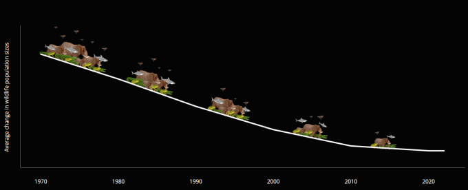 세계자연기금(WWF)이 런던동물학회(ZSL)와 함께 12일(현지시간) 발간한 '지구생명보고서 2022'(Living Planet Report)에 따르면, 전세계 포유류·조류·양서류·파충류·어류 등 척추동물 5230종을 대표하는 3만1821개 개체군의 규모가 1970년~2018년 사이에 69% 감소했다. 해마다 개체수가 2.5%씩 줄어든 셈이다.