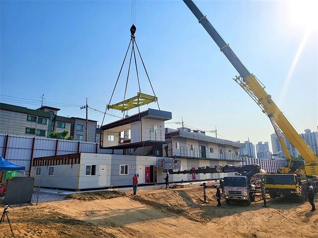 아파트 건설현장은 공사가 2~3년 진행되기 때문에 임시로 운영할 가설사무실을 설치한다. 공사가 끝나면 이런 사무실은 철거되고 폐기물로 남는 문제점이 있었다. 하지만 모듈러 공법으로 설치한 사무실은 모듈을 분리, 다른 현장에 재설치가 가능해 폐기물 발생을 80% 이상 줄일 수 있다.