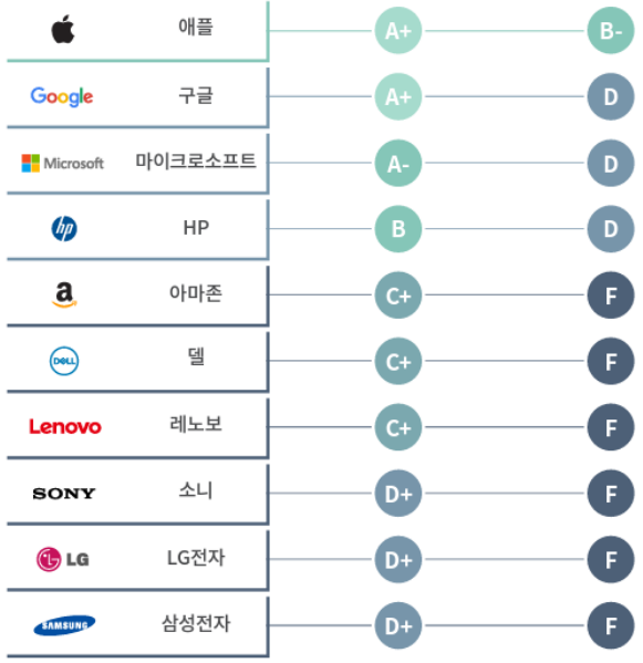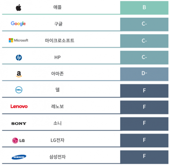 애플과 구글은 자체 기후위기 대응평가에서는 A+를 받았지만 공급망 관리부문으로 확대한 평가에서는 각각 B-와 D를 받으며 큰 차이를 보였다. 아마존과 델, 레노보 등도 자체 운영에서는 C+를 받았지만 공급망까지 확대한 평가에서는 모두 F로 떨어졌다.