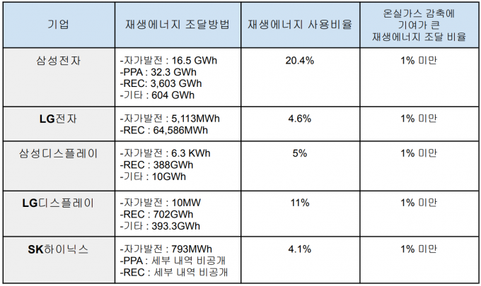 각각 'D+'와 'D'를 받은 삼성디스플레이와 LG디스플레이도 재생에너지 사용 비율은 각각 5%와 11%로 매우 낮은 수준이다. SK하이닉스는 반도체 공급업체 중 가장 낮은 점수 'D'를 기록했다. SK하이닉스는 2020년 국내에서 가장 먼저 RE100에 가입했다. 하지만 재생에너지 사용률은 4.1%에 그쳤다. 2019년 이후 온실가스 배출량은 11.7%나 증가했다.