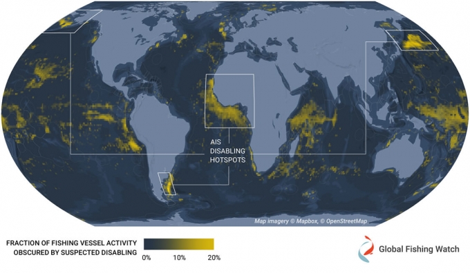 AIS 비활성화 빈도는 주요 환적지점과 분쟁지역의 배타적경제수역(EEZ) 경계 근처에서 가장 높았다. 비활성화 시간의 40% 이상은 IUU가 주로 발생하는 해역 4군데, 즉 북서태평양(13%), 아르헨티나(16%), 서아프리카(8%), 알래스카 인근(3%)에서 발생했다.
