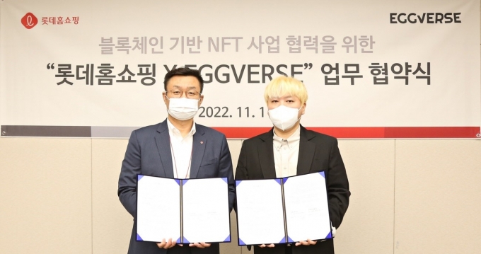 대체불가토큰(NFT) 플랫폼업체 에그버스가 11월 11일 11시에 맞춰 롯데홈쇼핑과 NFT 콘텐츠 사업 활성화를 위한 업무협약을 체결했다.