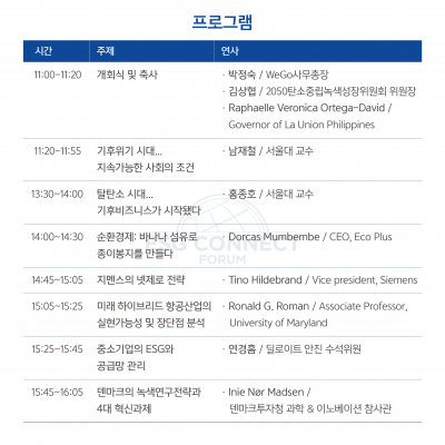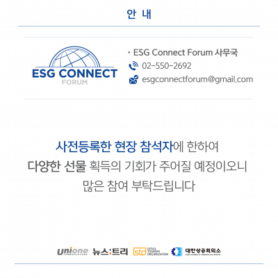 [ESG커넥트포럼]은 뉴스트리와 유니원커뮤니케이션즈가 공동주최하고 서울스마트시티국제기구(WeGO)와 서울관광재단, 대한상공회의소 후원으로 '탈탄소 시대, 지속가능한 사회를 위한 과제'를 주제로 개최됩니다.