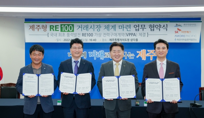 15일 아모레퍼시픽은 제주도청에서 진행된 '민·관 협력 제주형 RE100 거래시장 체계 마련 업무협약'에서 국내 최초로 VPPA를 체결했다고 밝혔다.