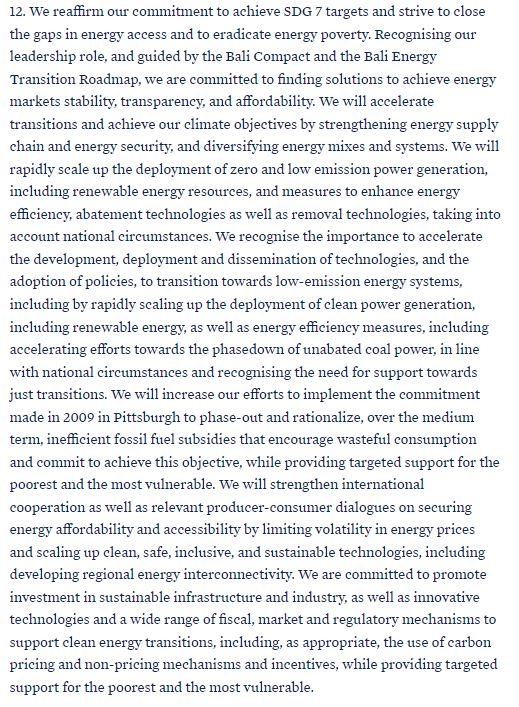 정상들은 석탄 발전 감축의 중요성과 재생에너지 확대의 필요성을 역설했다. 공식문건은 "줄어들지 않는 석탄 발전의 단계적 감축을 위한 노력 또한 가속화 할 것"이라며 "이와 동시에 재생에너지를 포함한 청정 발전의 배치 및 가속화의 중요성을 인식한다"고 밝혔다. 또한 "국가별 에너지 상황을 고려하여 재생에너지 확대 등 탄소 저감 기술, 에너지 효율 향상 등의 기술에 대한 대책을 신속하게 확대할 것"이라고 선언했다.