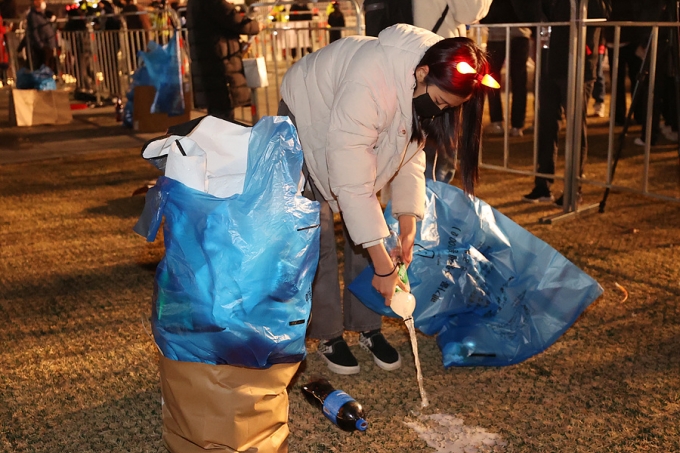 경기가 종료된 후 거리응원 참가자들의 시민의식도 엿볼 수 있었다. 일회용품 규제 첫날을 맞아 시민들은 곳곳에 마련된 파란색 종량제봉투에 주워 담으며 자리를 정돈했다. 일부 시민은 쓰레기를 그대로 둔 채 떠났지만, 대다수는 적극적으로 쓰레기를 치웠다. 몇 사람은 봉투를 잡고 직접 돌아다니며 쓰레기를 수거하기도 했다.