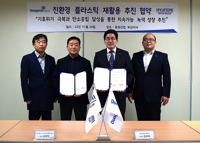 동원산업은 지난달 24일 현대차·기아와 '친환경 플라스틱 재활용 추진' 협약을 체결했다고 6일 밝혔다. 동원산업은 연간 약 465톤의 폐어망을 분리배출하고 현대차·기아는 폐어망을 재활용해 자동차 부품을 만든다.