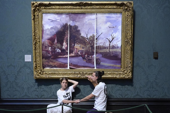 영국의 환경 단체 ‘저스트 스톱 오일(Just Stop Oil)’ 활동가인 이들은 지난 7월 내셔널갤러리에서 존 컨스터블의 대표작 중 하나인 ‘건초 마차(The Hay Wain)’에 디스토피아적인 풍경이 인쇄된 포스터를 붙이고 액자에 손을 테이프로 고정하는 등 시위를 벌였다.