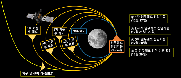 다누리는 지난 8월 5일 발사 후 약 4.5개월간 지구-달 전이 궤적을 따라 총 594만km를 비행했다. 12월 17일 달에서 약 108km 거리까지 근접한다. 이후 다누리는 12월 17일부터 12월 28일까지 총 5차례의 LOI를 거쳐 달 임무궤도(달 상공 100km)에 안착할 예정이다.