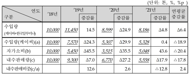 보고서에 따르면 KC와 한국알루미나의 베트남산 수입총량은 2018년을 1만톤 기준으로 환산하면 2019년 1만1450톤, 2020년 8599톤, 2021년 8186톤이다. 이는 관세청이 집계한 베트남산 수산화알루미늄의 수입량 2019년 11만3214톤, 2020년 8만5056톤, 2021년 8만936톤을 환산한 데이터 2019년 1만1454톤, 2020년 8605톤, 2020년 8188톤과 비슷하다.