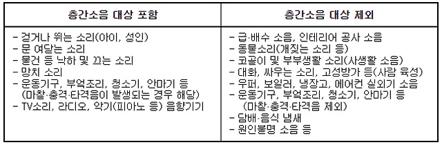 환경부는 "직접 충격소음 최고소음도의 현재 기준값은 세계보건기구(WHO)가 권고하는 수준을 충족한다"며 "공기전달 소음은 전체 민원의 1.5% 정도로 비중이 낮아 검토 대상에서 제외했다"고 설명했다.