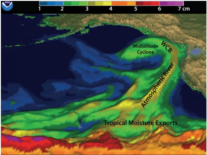 '대기의 강'(Atmospheric rivers) 현상은 대기중에 흐르는 길고 좁은 수증기 띠를 말한다. 대기의 강은 모양과 크기가 다양하지만 엄청나게 많은 수증기와 강한 바람을 동반하고 있다. 예전에는 일부 지역에서 약하게 나타나던 이 현상이 기후변화로 지구온도가 상승하면서 갈수록 세력이 커져 피해지역도 광범위해지고 있다. 이 수증기 띠가 높은 산맥과 같은 장애물을 만나면 폭우나 폭설이 발생할 수 있다.