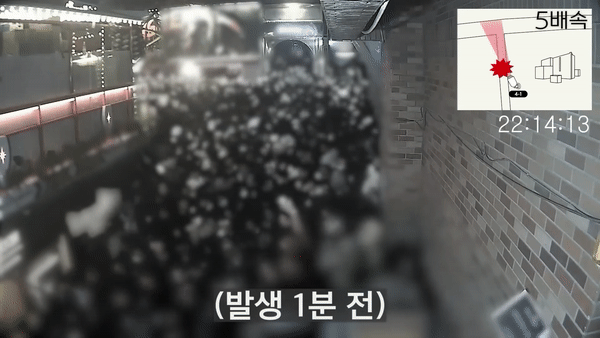 사고 발생 골목 폐쇄회로TV(CCTV)와 국립과학수사연구원 시뮬레이션 분석 결과, 해당 골목의 군중 밀도는 오후 10시15분께 평방미터(㎡)당 7.72~8.39명에서 5분 뒤 ㎡당 8.06~9.40명으로 증가했다.