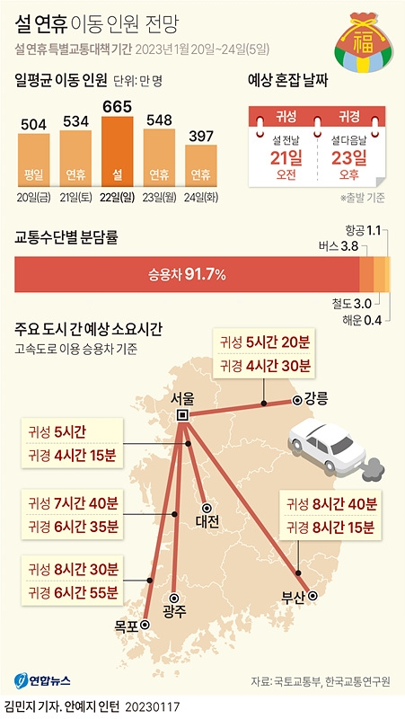 작년 설보다 연휴 기간이 하루 짧지만 일상 회복에 따라 이동 인원은 총 2.1% 증가하고 일평균 이동 인원은 22.7%까지 증가할 것으로 추정됐다.