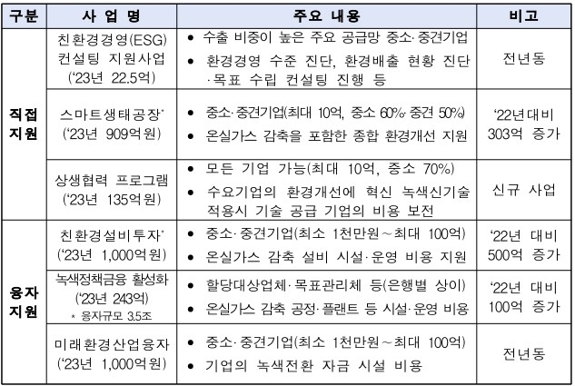 직접 지원사업은 국내 제조업체의 '친환경경영(ESG) 자문(컨설팅) 지원사업'을 필두로 환경설비 교체 등에 필요한 자금을 지원하는 '스마트 생태공장 구축지원'과 '상생협력 실증 프로그램'으로 구성됐다.