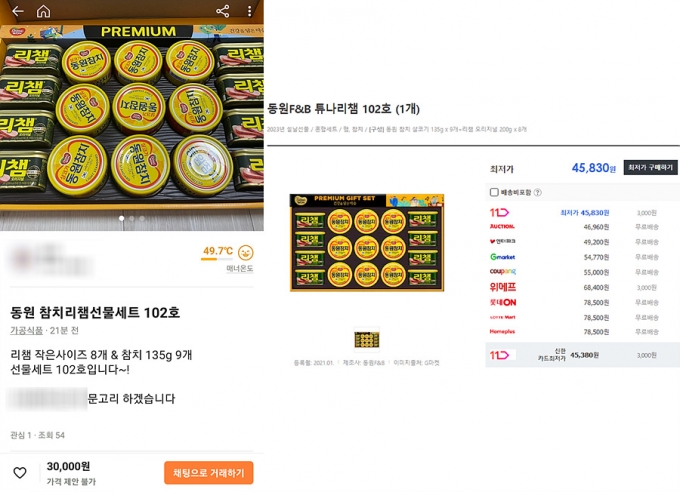 19일 당근마켓 등 중고거래 플랫폼에 따르면 스팸, 참치캔, 올리브유 등 각종 선물 세트가 인터넷 최저가 대비 평균 20~50%가량 저렴한 가격에 거래되고 있는 것으로 나타났다. 햄과 참치캔으로 구성된 '동원 선물세트 102호'는 인터넷 최저가 4만5830원이지만, 중고거래 플랫폼에선 3만원 선에 거래됐다. 홈플러스몰에서 4만2540원에 판매되는 'CJ 스팸복합 100호'도 3만원 대로 거래됐다.