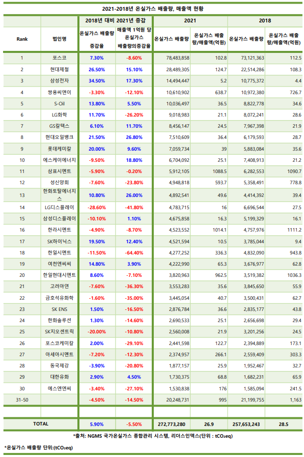 이 분석에 따르면 2021년 국내 상위 50대 기업이 배출한 전체 온실가스 총량은 2억7277만톤이다. 이는 '2030 국가온실가스감축목표'(NDC) 기준연도인 2018년의 배출량 2억5765만톤보다 5.9% 증가한 것이다. 반면 해당기간 국가 전체 온실가스 배출량은 7억2760만톤에서 6억7960만톤으로 6.6% 감소한 결과를 보였다.