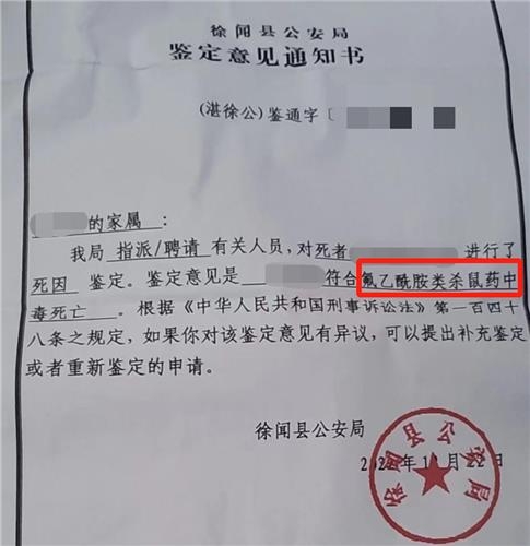 현지 공안 조사 결과 빵을 제조한 매장에서 쥐를 없애기 위해 쥐약을 밀가루에 섞어뒀는데 이를 가지고 빵을 만든 것으로 밝혀졌다. 숨진 소녀뿐만 아니라 이 매장에서 빵을 사먹은 이들 중 설사나 구토 증세를 보이는 경우도 있었던 것으로 나타났다. 공안은 사망 사건과 관련해 독극물 성분에 중독돼 숨진 것으로 확인되자 빵 생산업체 대표 등 8명을 체포했다.