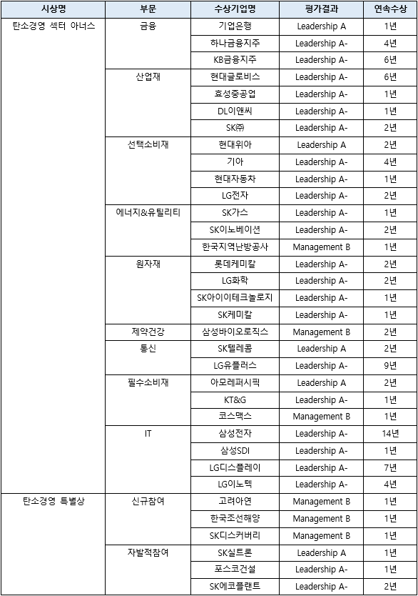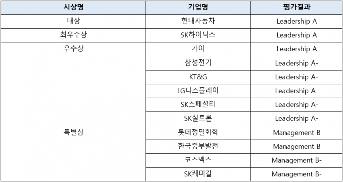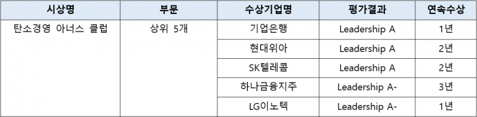 이번 평가에서 기후변화부문 최우수 기업으로 기업은행과 현대위아, SK텔레콤, 하나금융지주, LG이노텍 등 5곳이 선정됐다. 이 5곳은 '탄소경영 아너스클럽'(Carbon Management Honors Club)에 자동으로 편입된다.