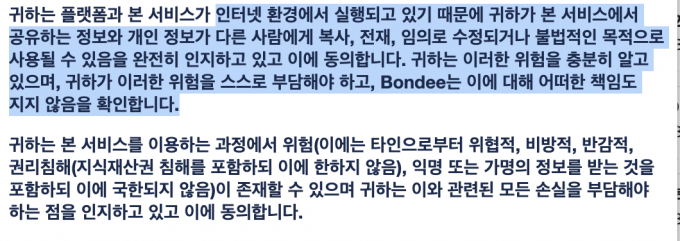 본디가 이같은 논란에 휩싸인 이유는 애플리케이션에 명시된 약관 때문이다. 약관 내용에 따르면 본디 애플리케이션을 이용하는 동안 앱 내에서 이용되는 개인정보를 제 3자가 이용하더라도 앱에서 책임지지 않는다.