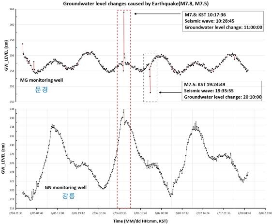 강릉 관측정에서는 본진 후 수위가 3㎝ 상승한 것이 탐지됐다.