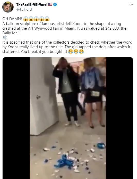 19일(현지시간) 뉴욕타임스(NYT) 등 외신에 따르면 지난 16일 밤 미국 마이애미에서 '아트 윈우드' 아트페어 개막을 맞아 열린 VIP 프리뷰 행사에서 한 여성 방문객이 쿤스의 '풍선개'(Balloon Dog)를 손으로 두드려 받침대에서 떨어뜨렸다.