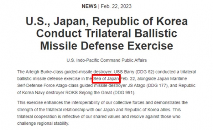 미국 인도·태평양사령부가 지난 22일 동해 공해에서 북한의 대륙간탄도미사일(ICBM) 등 미사일 도발에 대응한 미사일 방어훈련을 할 때 훈련 장소를 동해가 아닌 일본해로 표기하자 우리 군 당국과 외교부도 수정을 요구한 바 있다.