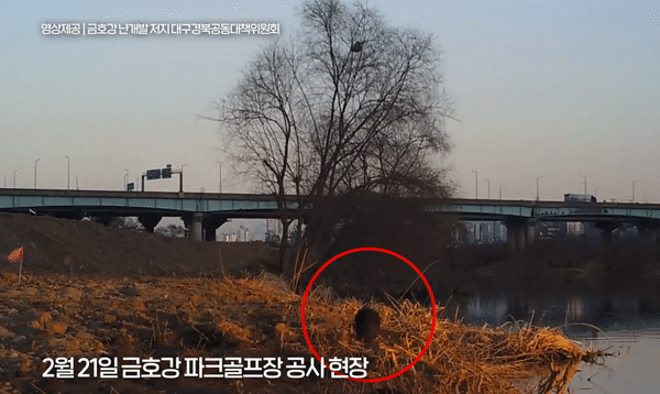 대구환경운동연합은 대구 북구 사수동 금호강 둔치에서 벌이는 파크골프장 공사현장에서 천연기념물이자 멸종위기 야생생물 1급인 수달이 발견됐다고 24일 밝혔다. 대구환경운동연합이 지난 21~23일 수달의 서식처로 추정되는 이곳에 무인카메라를 설치해 출몰 여부를 관찰한 결과다.