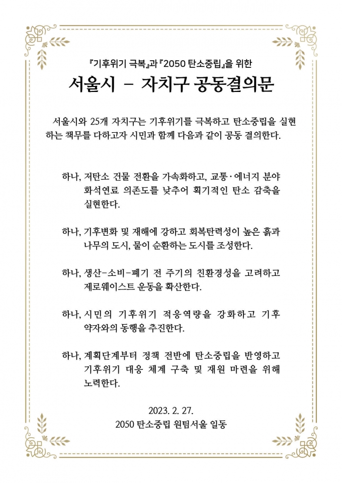 이 자리에서 서울시와 자치구는 기후위기 극복과 탄소중립 실현을 위한 5가지 사항을 공동 결의했다.