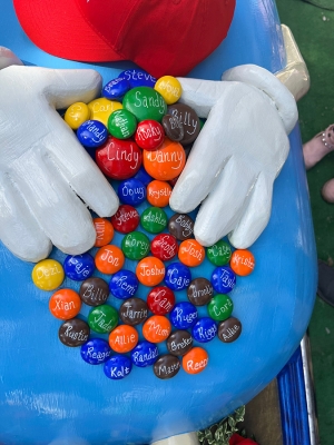 사진 속 파란색 엠앤엠즈 캐릭터는 두 손을 모은 채 편안하게 눈을 감고 있는 모습이다. 캐릭터의 배 위에는 메리가 생전에 소중하게 여긴 이들의 이름이 새겨진 초콜릿이 놓여있었고 그의 가족들도 메리를 기리는 의미에서 엠앤엠즈 모자와 티셔츠를 입었다.