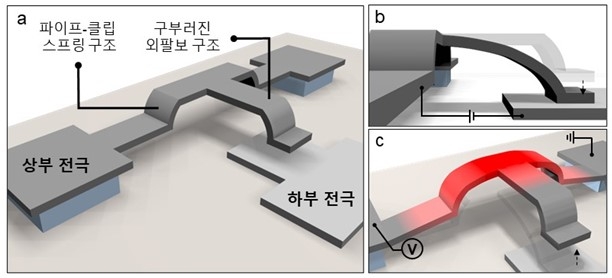 연구팀은 반도체 메모리를 사용하는 대신, 나노 크기의 매우 작은 기계 구조에 전기 신호를 가함으로써 나노 기계 구조체가 실제로 움직여서 하부 전극에 붙고 떨어지는 방식을 사용했다. 또 매우 낮은 프로그래밍 에너지를 달성하기 위해 파이프-클립 스프링 구조와 구부러진 외팔보 구조로 구성된 상부 전극을 도입했다. 특히 파이프-클립 모양의 나노 기계 구조에 전류를 가해 열을 내는 구동 방식을 통해 프로그램된 구조체가 초기 상태로 복구할 수 있도록 해 반복적인 프로그램 동작에도 낮은 프로그래밍 에너지를 유지할 수 있도록 했다.