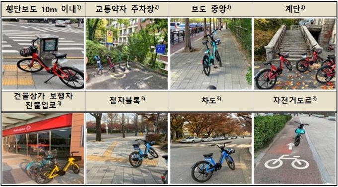 공유 전기자전거 이용 경험자 500명 가운데 213명(42.6%)은 통행에 방해를 줄 수 있는 버스정류장 10m 이내나 지하철역 진출입로를 적절한 주차 장소로 잘못 인식하고 있었다. 버스정류장 10m 이내는 '도로교통법'상 주·정차 제한구역이고, 지하철역 진출입로 직좌우 이동방해 구역은 공유 킥보드 주차 제한구역이다.