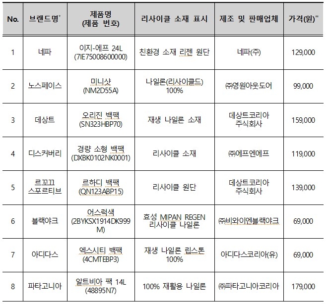 스포츠·아웃도어 8개 브랜드에서 시판하는 리사이클 나일론 백팩은 모두 재활용 원단을 사용한 것으로 확인됐다. 또 유해물질도 검출되지 않았다.