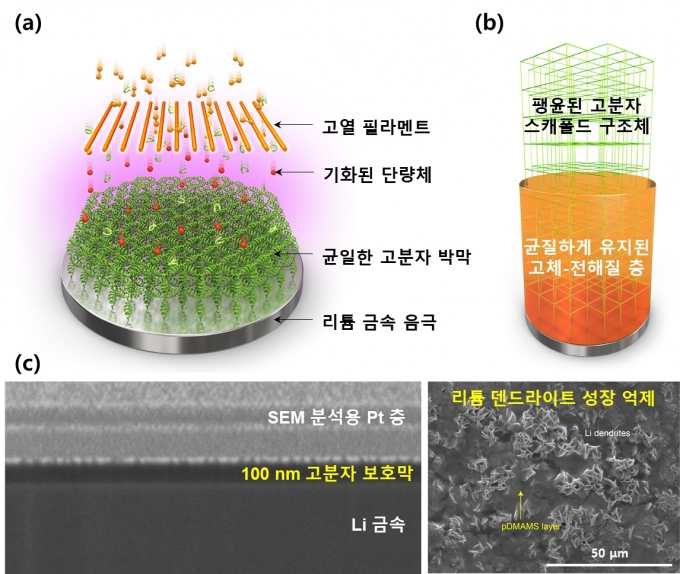 이번 연구팀은 이를 해결하기 위해 '개시제를 이용한 화학 기상 증착법'(initiated chemical vapor deposition, iCVD)이라는 공정을 이용했다. 이 공정 기술은 리튬금속 표면에 손상없이 보호막으로 적용되도록 용매를 사용하지 않는 온화한 조건에서 공정을 진행하며 기능성 고분자 박막을 얇게 균일하게 적용할 수 있다는 장점이 있다.